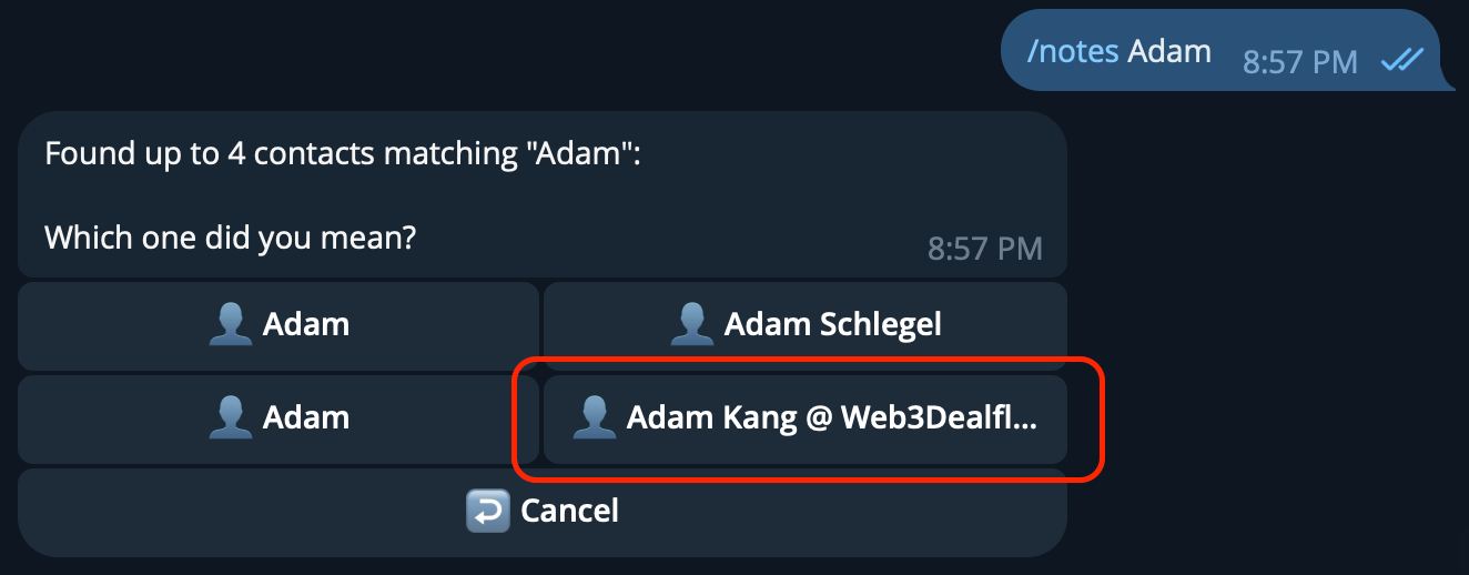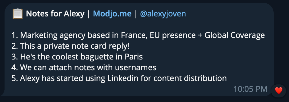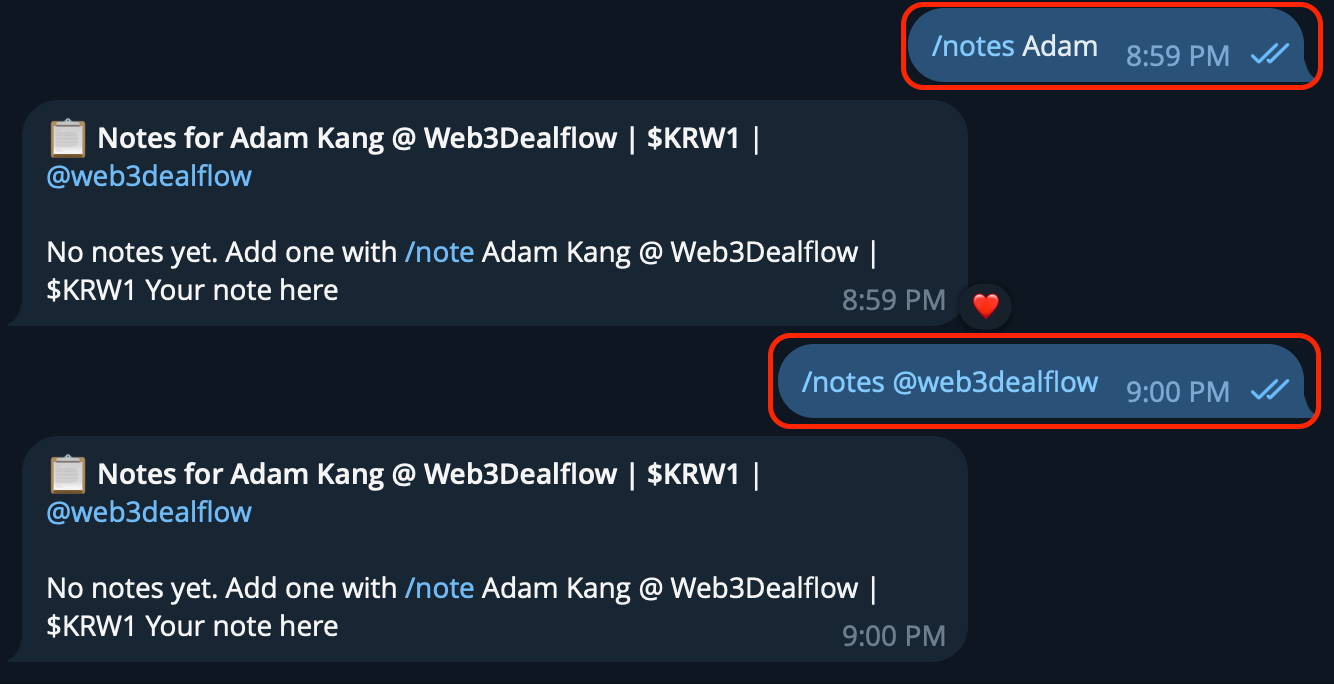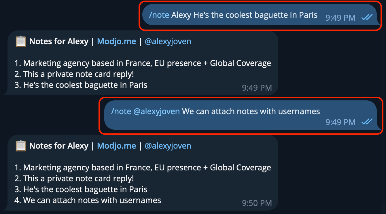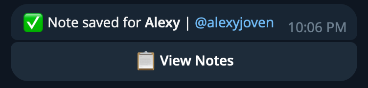 /notes John(or/notes @username) to pull up notes for the most recent or best-matching contact - Access all saved notes through your exports