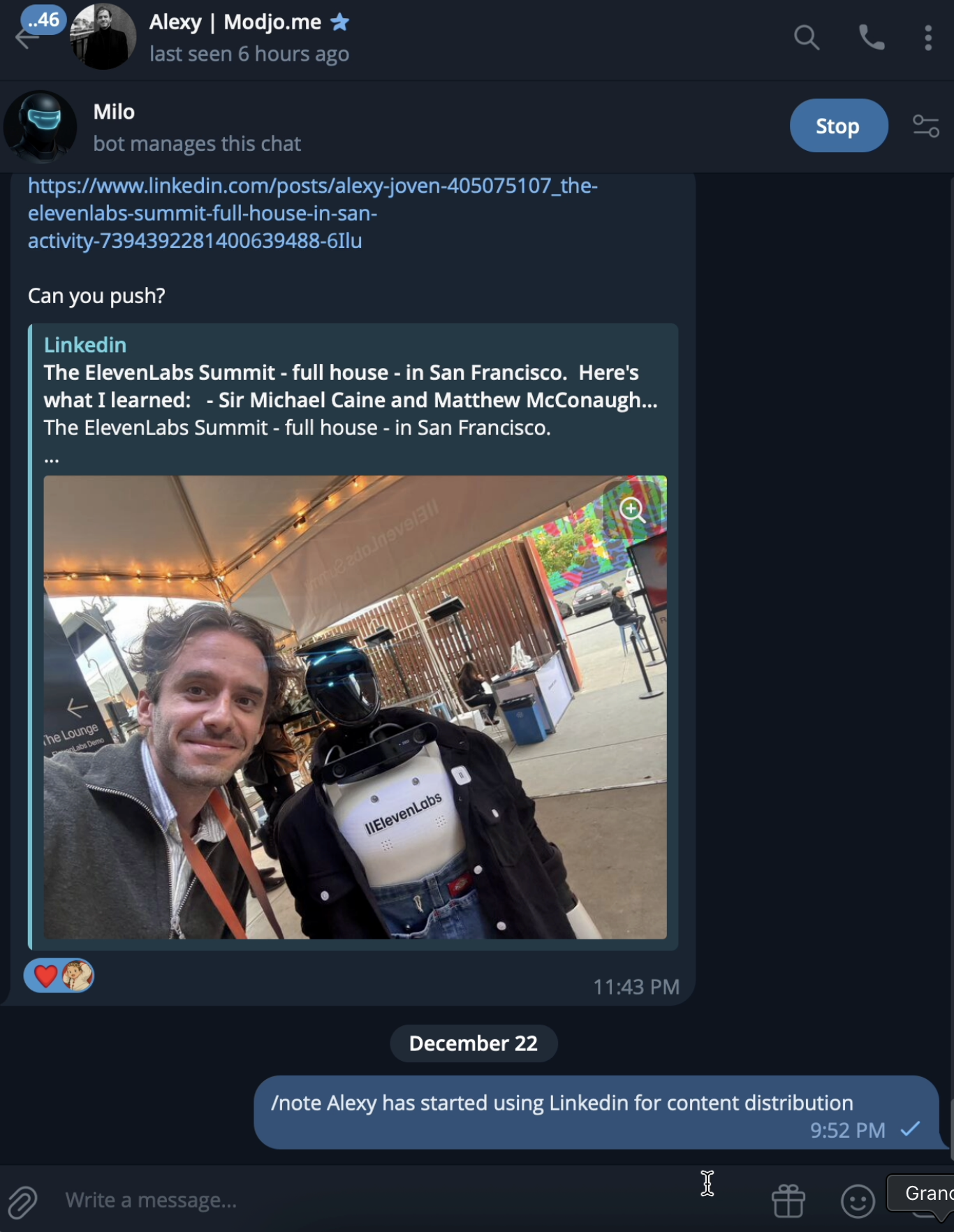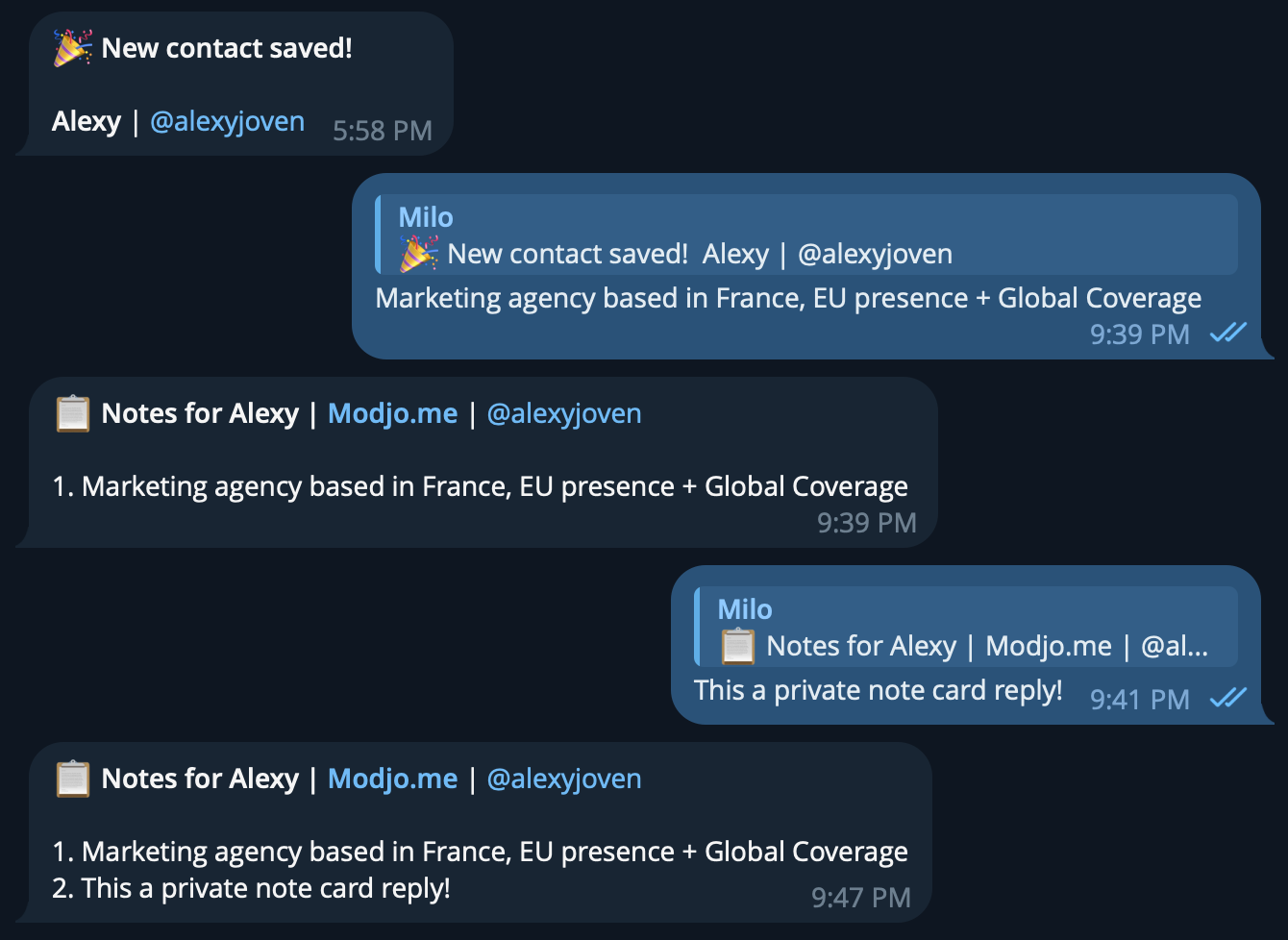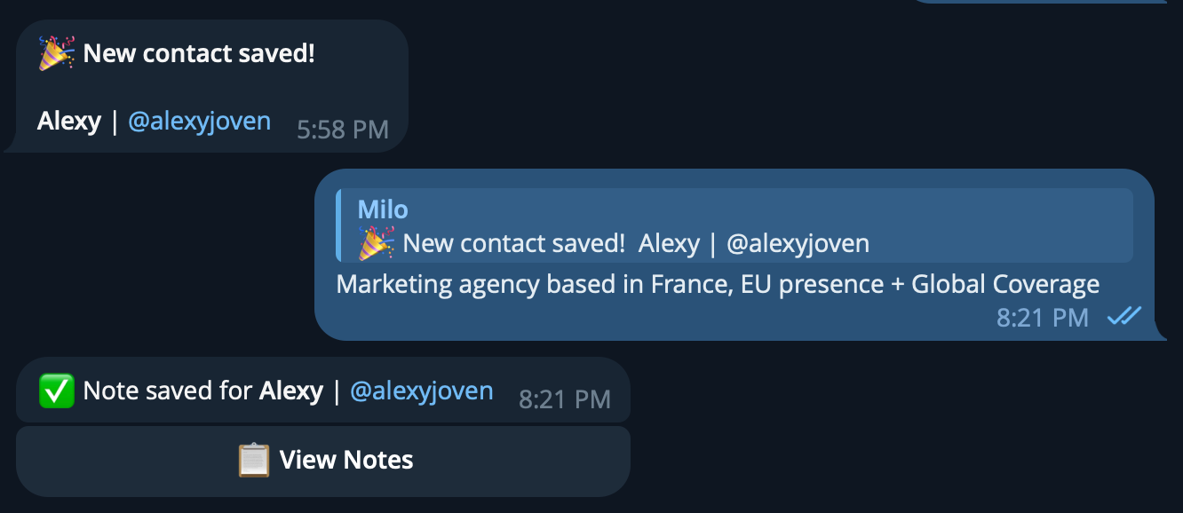 Each newly added contact triggers a private contact card in your chat with MILO.
